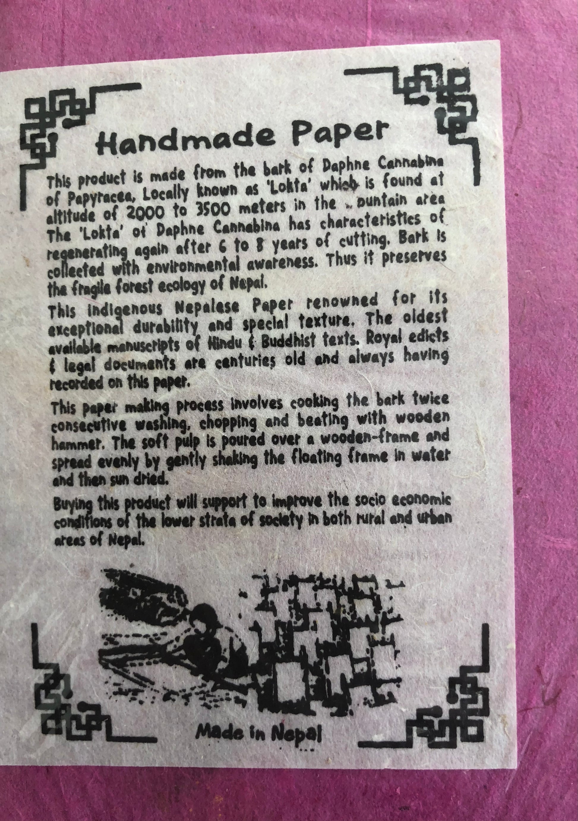 The product is made from the Daphne Cannabina of Papyroes. This is locally known as "Lokta" and regenerates
