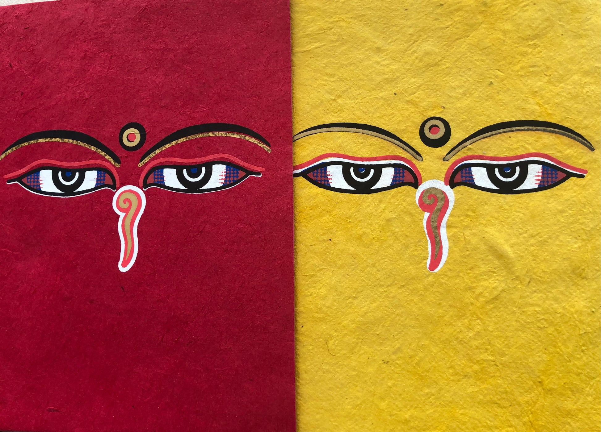 These sets all contain eight multi-coloured cards (which can also be in a Buddha design) with envelopes, so each pack contains all the colours shown.