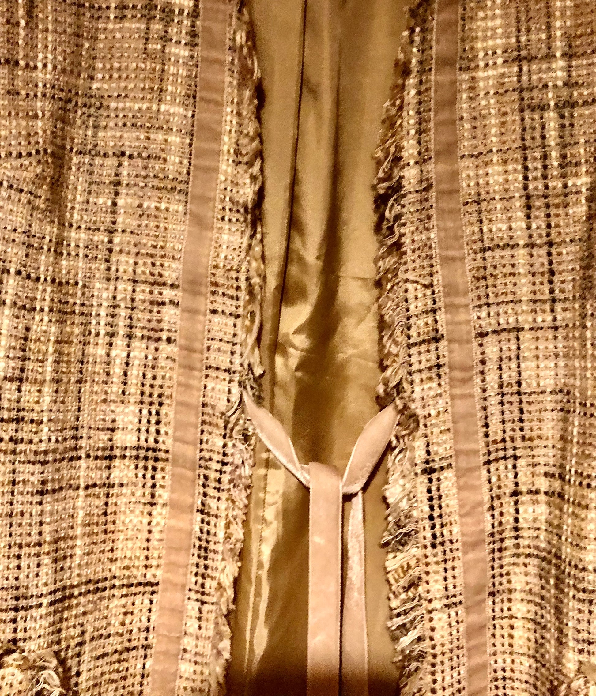 This feminine and elegant edge-to-edge jacket is soft to the touch and easy to slip on and wear. It is fringed and trimmed in velvet, with fringed turn-back cuffs. The colour is cream and grey.. It has two deep pockets. Should you want to fasten it, it has a velvet ribbon to tie it at the waist. The size is 16. Dry clean only.