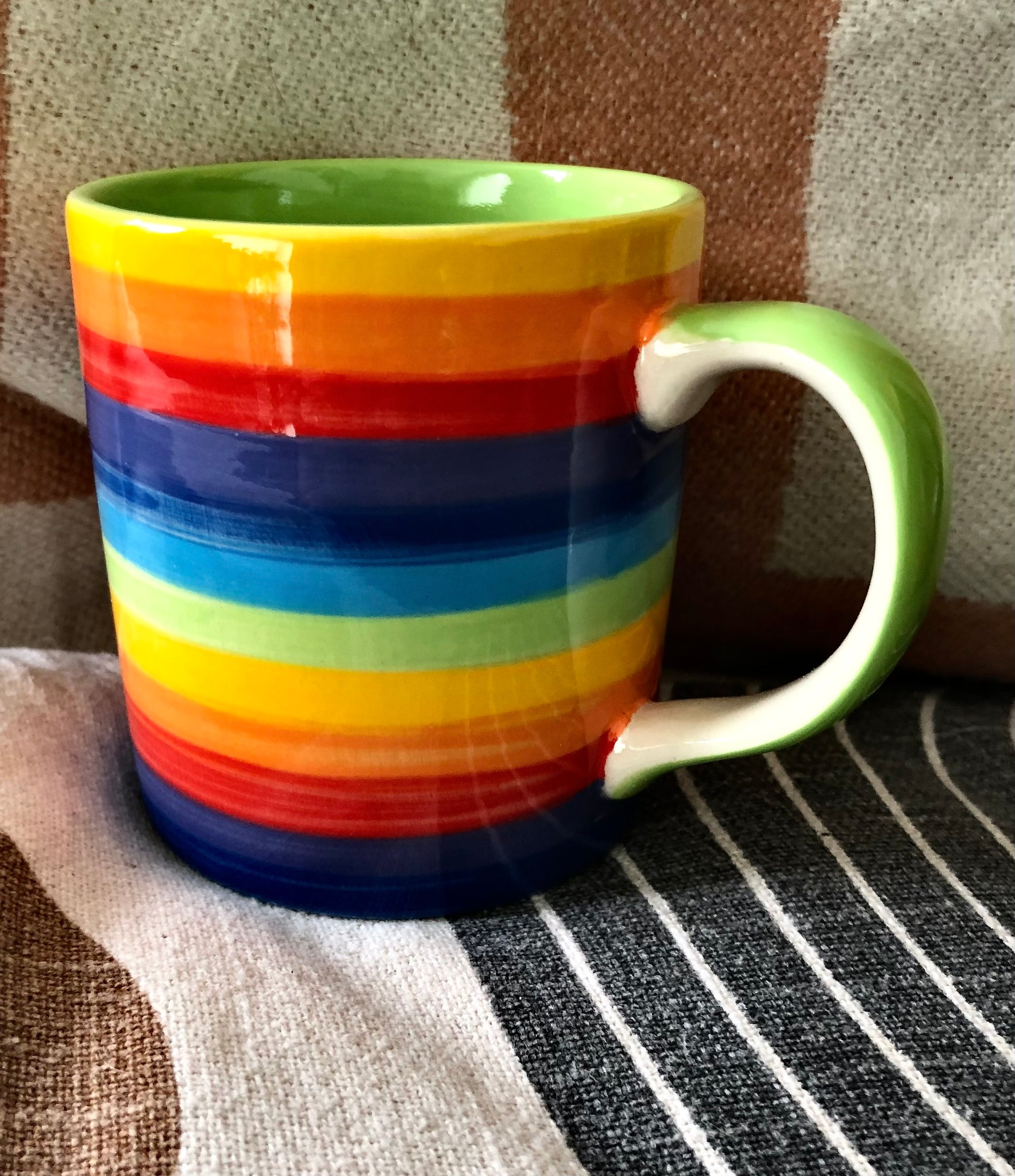 Wonderfully cheerful, this rainbow stripe ceramic mug brightens up any home. The vibrant stripes are hand painted giving each piece individual character. Made for Namaste by our long term Thai partner producer.