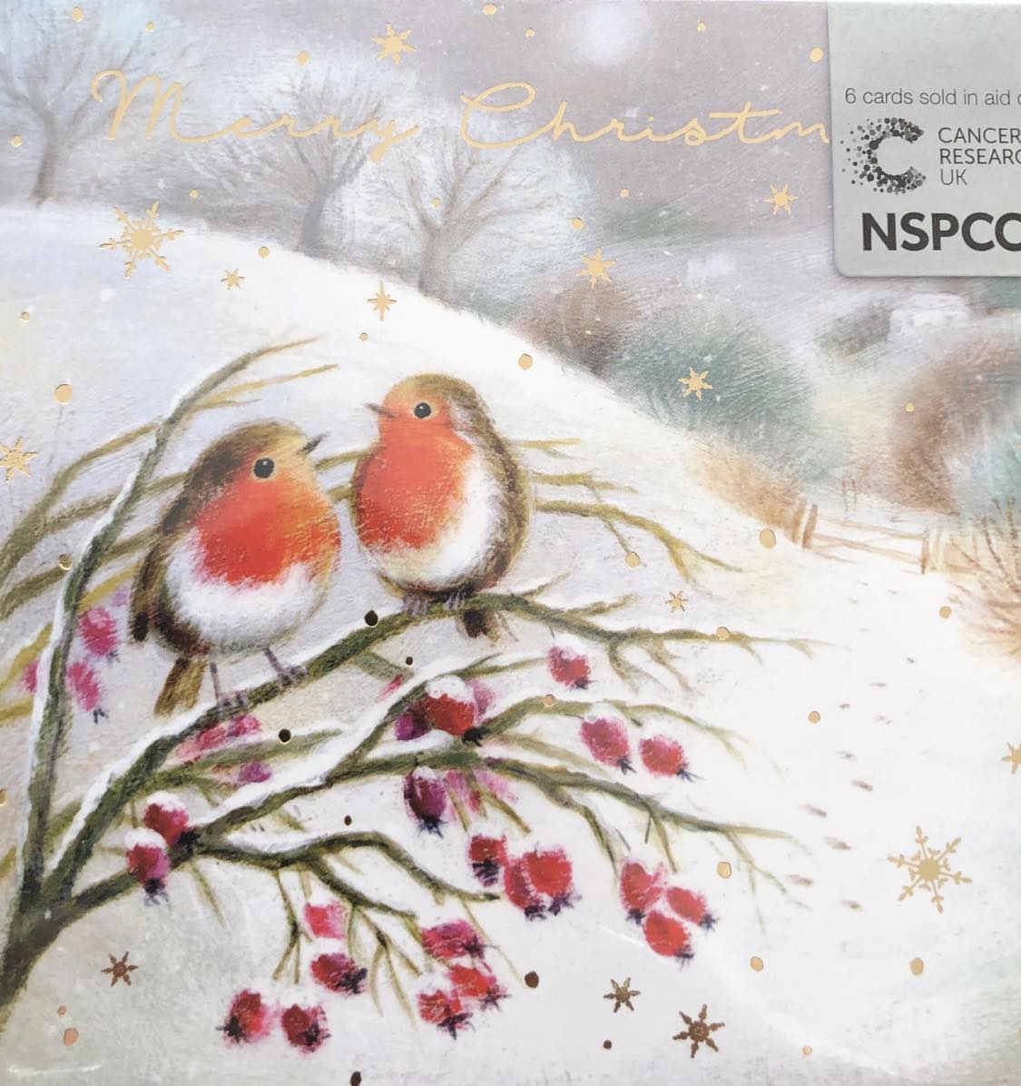 Robins on branch charity Christmas cards pack. Six cards in the pack. A donation of 35 p from the cost of this pack is shared between NSPCC and Cancer Research.