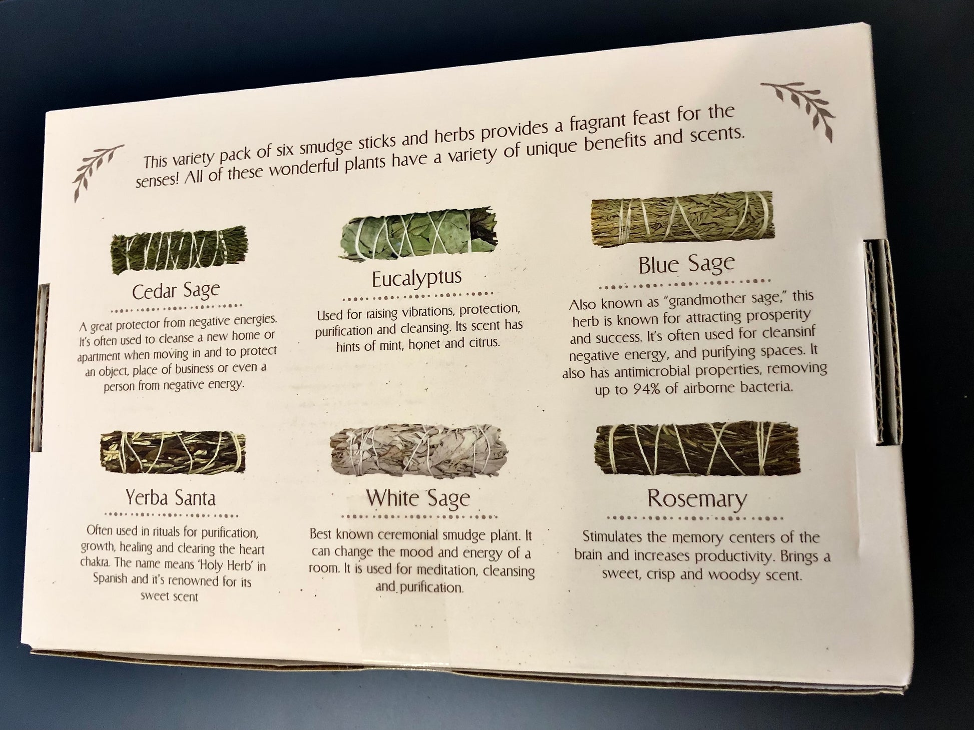 This set of sage includes six varieties of smudge sticks and herbs, each with unique spiritual benefits and scents. Bundles include Cedar Sage for protecting from negative energies, Eucalyptus for raising vibrations, Blue Sage for attracting prosperity, Yerba Santa for purification, White Sage for cleansing, and Rosemary for increasing productivity. Presented in a luna moth gift box.