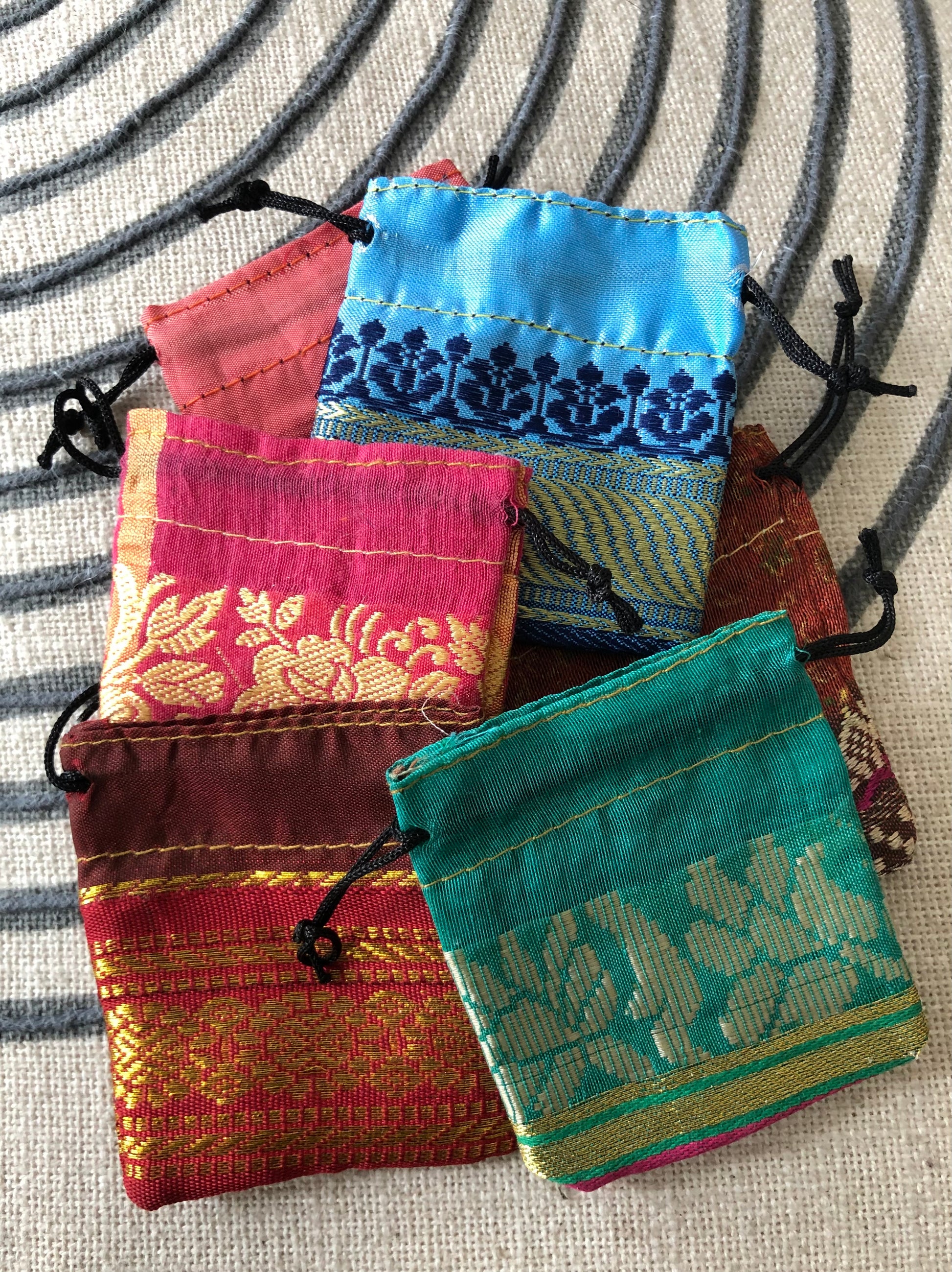 Six gorgeous little pouches made from sari silk. Ideal for gifts and trinkets. 6 varied designs in each collection. Designs and colours will vary but all are lovely.