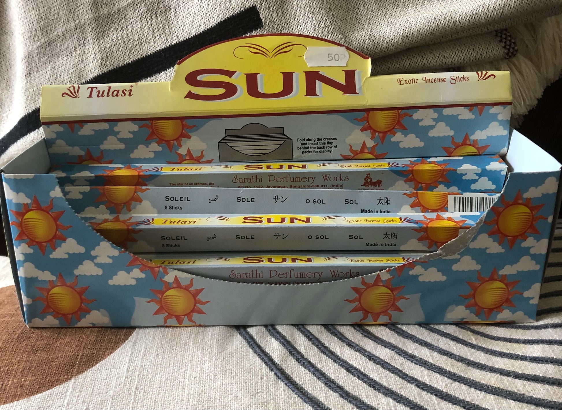 This is part of a box of Sun incense. This is the small slim pack, usually retailing at 50p per box (7.50 for the fifteen slim boxes we have in stock), but we are offering the entire 15 boxes we have left at the amazingly low price of just £5.