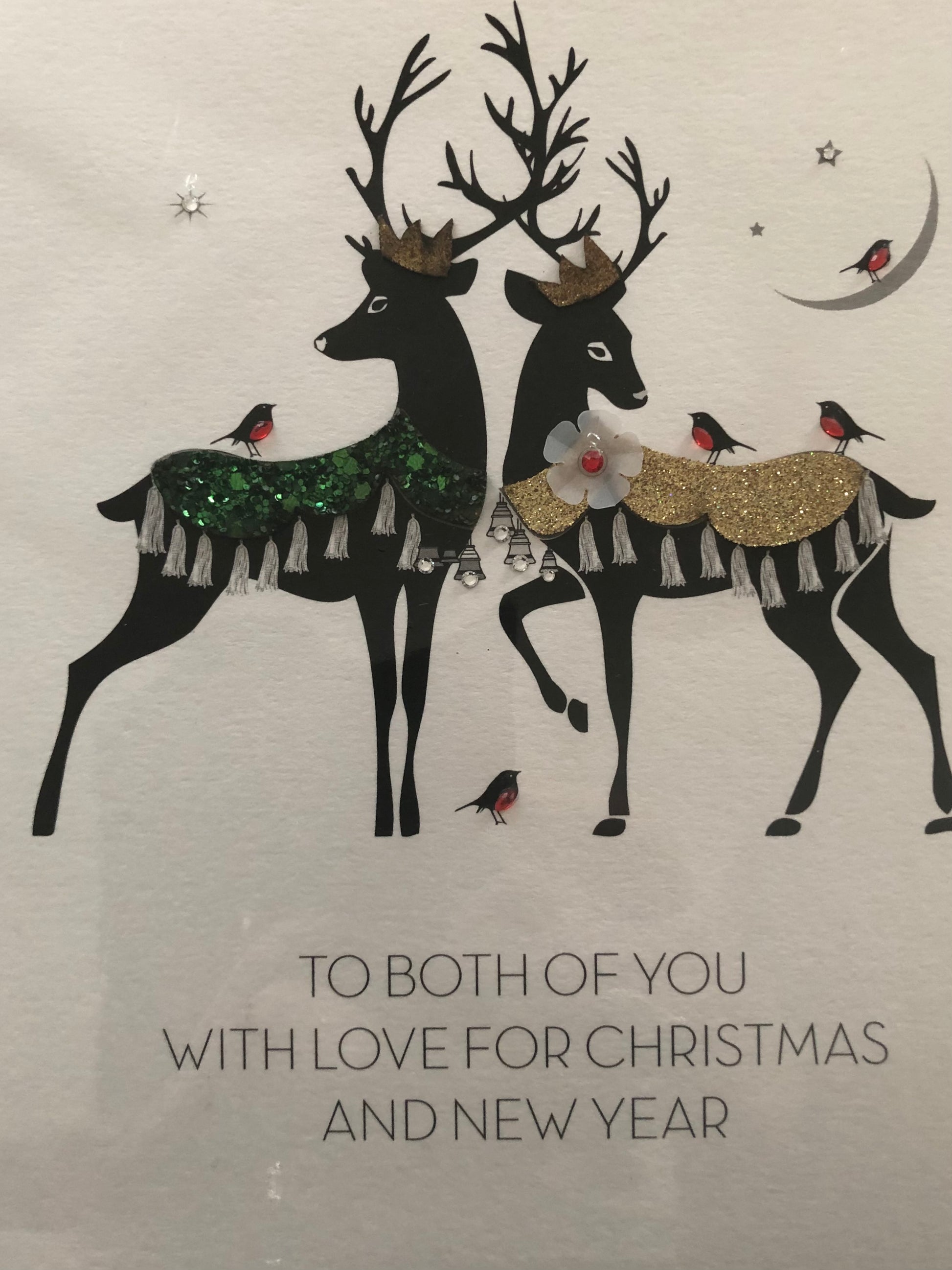To Both of You. Large Christmas Card. (8 ins/20.32 cm x 8 ins/20.32 cm). Lovingly handmade in Sussex with genuine crystals and glitter fabric. This was £7.50 in our shop but we offer it here for just £4.99.